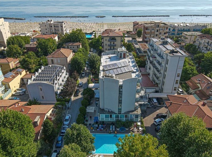 hotel sa nachádza neďaleko Rimín, v časti Viserbella • 100m od širokej pláže s jemným pieskom a pozvoľným vstupom do mora • v blízkosti štýlových barov, kaviarní a bohatých nákupných možností • 2,5 km od zábavného parku Italia in Miniatura