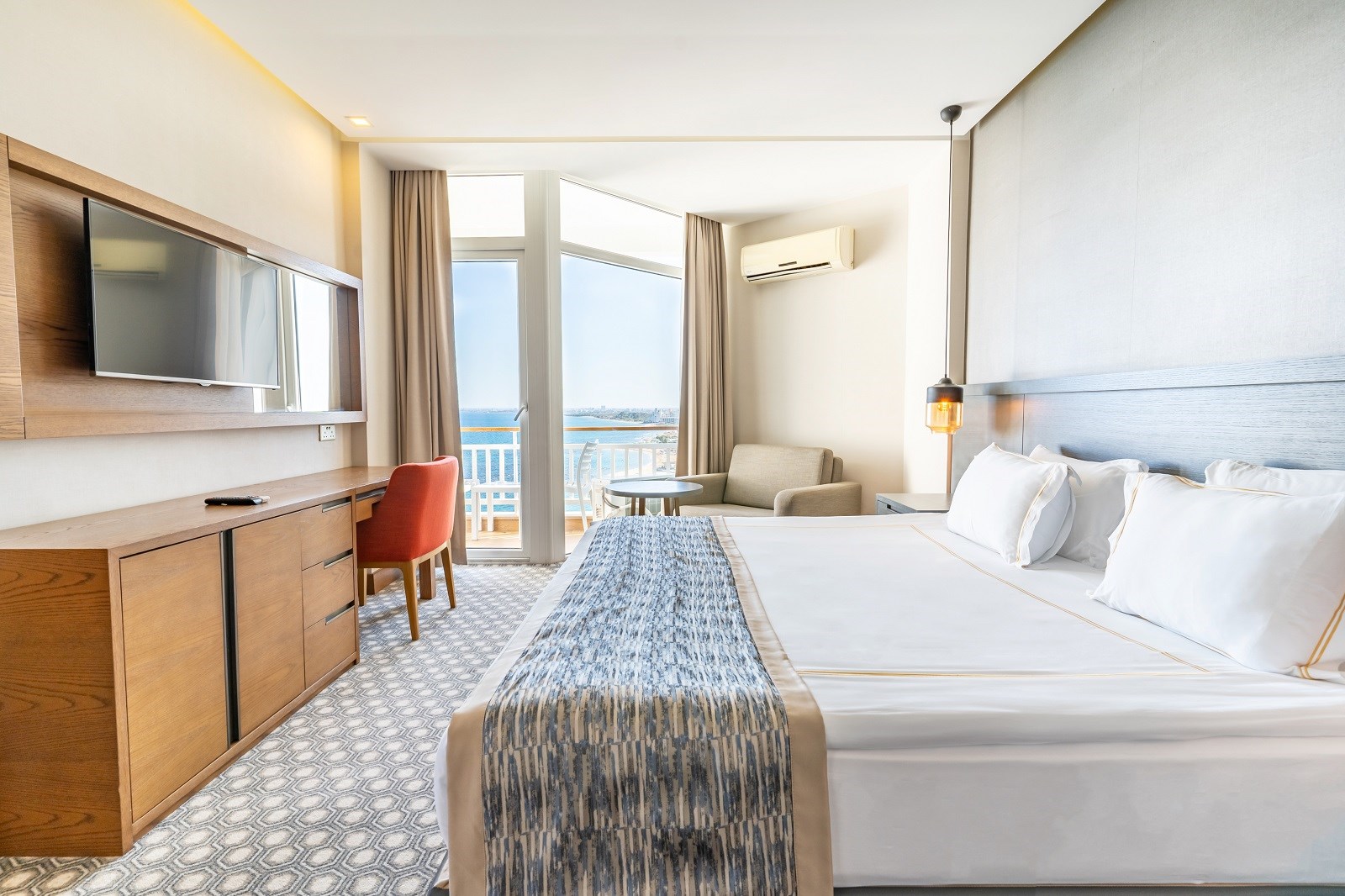 2-lôžkové izby s možnosťou 1 - 2 prísteliek v areáli rezortu (v hlavnej hotelovej budove a v časti Park za príplatok) • izby s výhľadom na more za príplatok • klimatizácia • telefón • minibar (naplnený pri príchode - zdarma) • set na prípravu kávy a čaju • TV • trezor • kúpeľňa s vaňou, resp. sprchou a WC • sušič na vlasy • wifi • balkón s posedením
