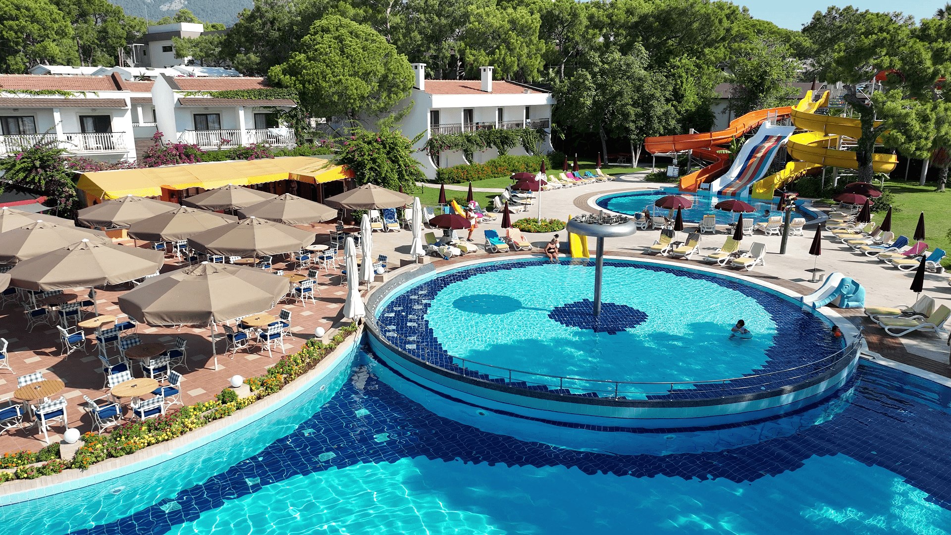 hotelový komplex pozostáva z hlavnej budovy a dvojpodlažných viliek • vstupná hala s recepciou • hlavná reštaurácia s posedením na vonkajšej terase • pool bar • snack bar • disco bar • a´la carte reštaurácia (nutná rezervácia vopred) • rozsiahly vonkajší bazén • detský bazén so šmykľavkami • bazén s 3 toboganmi • SPA a wellness centrum (masáže a turecké kúpele za poplatok) • sauna • fitness centrum • aerobik • vodné pólo • tenisové kurty (príslušenstvo a osvetlenie zdarma) • stolný tenis • basketbal • plážový volejbal • biliard (za poplatok) • šach • šípky • miniklub • detské ihrisko • herňa (za poplatok) • vodné športy na pláži (za poplatok) • wifi v spoločných priestoroch (zdarma) • amfiteáter • tematický večerný program • medzinárodné hotelové animácie počas dňa pre deti a dospelých