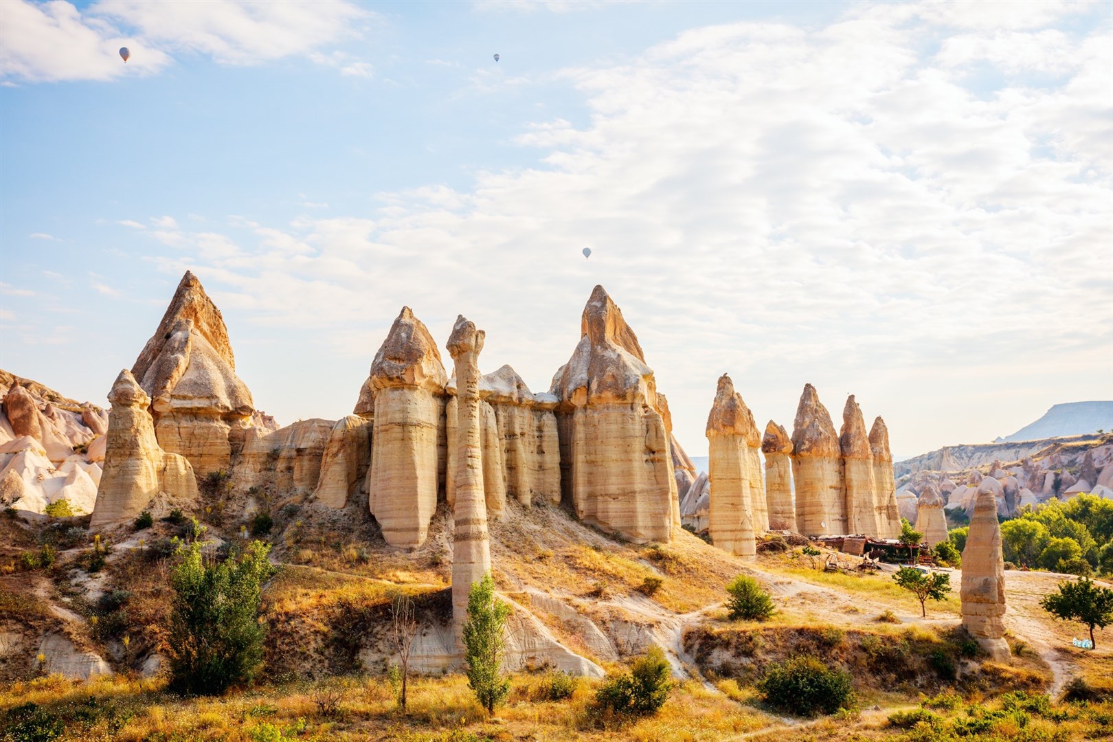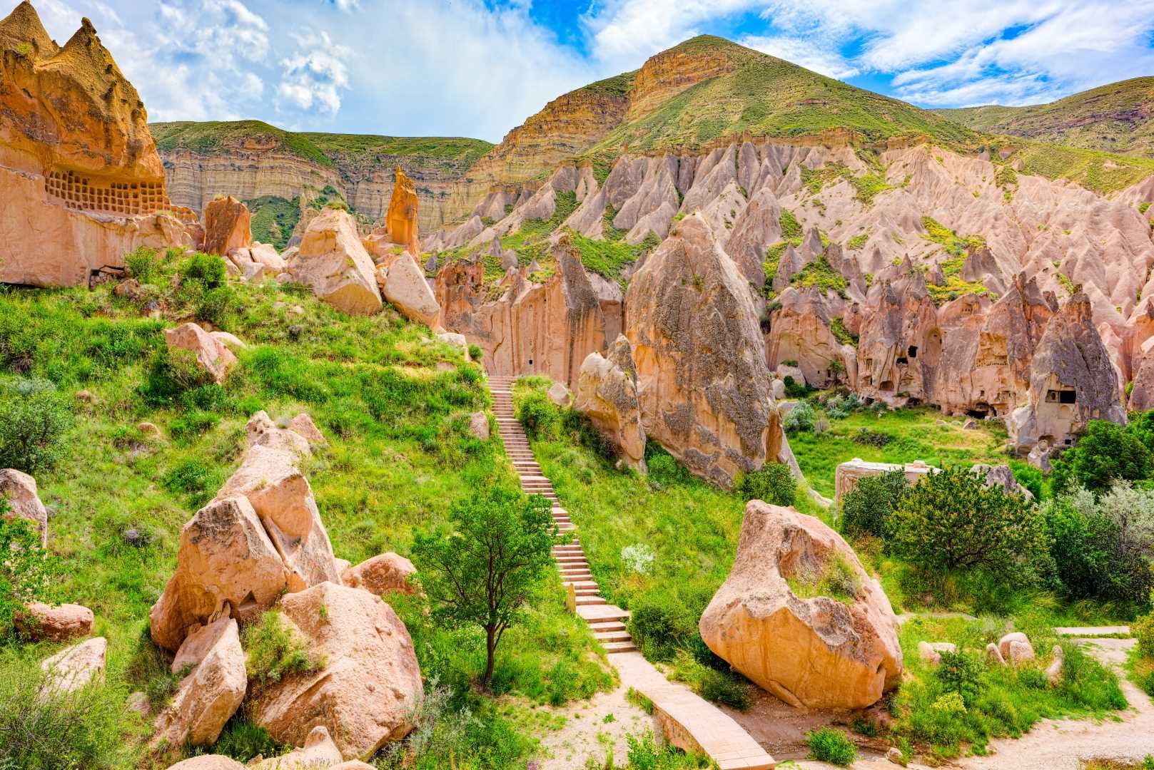 5. deň » po raňajkách celodenné objavovanie jednej z najkrajších oblastí Turecka – Kappadokie, fascinujúcej a jedinečnej krajiny vytvorenej sopečnou lávou pred viac ako 3 miliónmi rokov. Návšteva múzea pod holým nebom v Göreme (UNESCO), ktoré ukrýva kaplnky vytesané do sopečných útvarov. Výstup na vrchol Uchisar, prehliadka údolí Avcilar a Guvercinlik, známych svojimi rozprávkovými komínmi. Zastávka v centre výroby kobercov, kde spoznáte tvorivosť anatólskych žien. Fakultatívny výlet (extra platba): ranný let balónom nad rozprávkovými komínmi a nádhernou krajinou a folklórny večer v jaskynných priestoroch. Večera a prenocovanie v hoteli v Kappadokii.